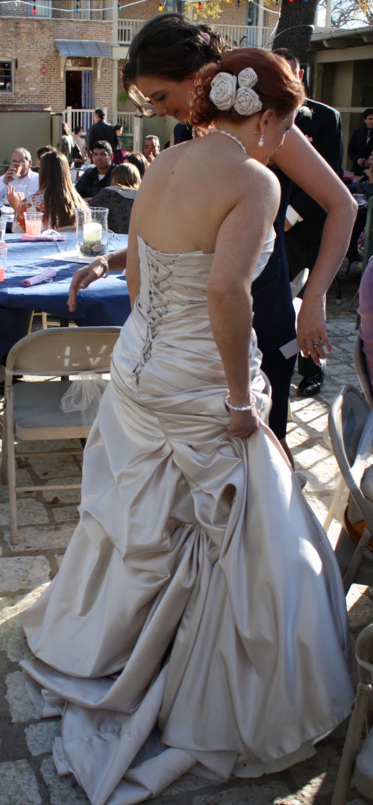 The lovely champagne gown. I made the hair accessories from the extra fabric hemmed off the dress. |